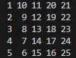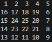 Xotira: 32 MB, Vaqt: 3120 msSizga N soni beriladi. Siz esa NxN matritsada 1 dan \(n^{2}\) gacha sonlarni quyidagi tartibda joylashtirasiz: